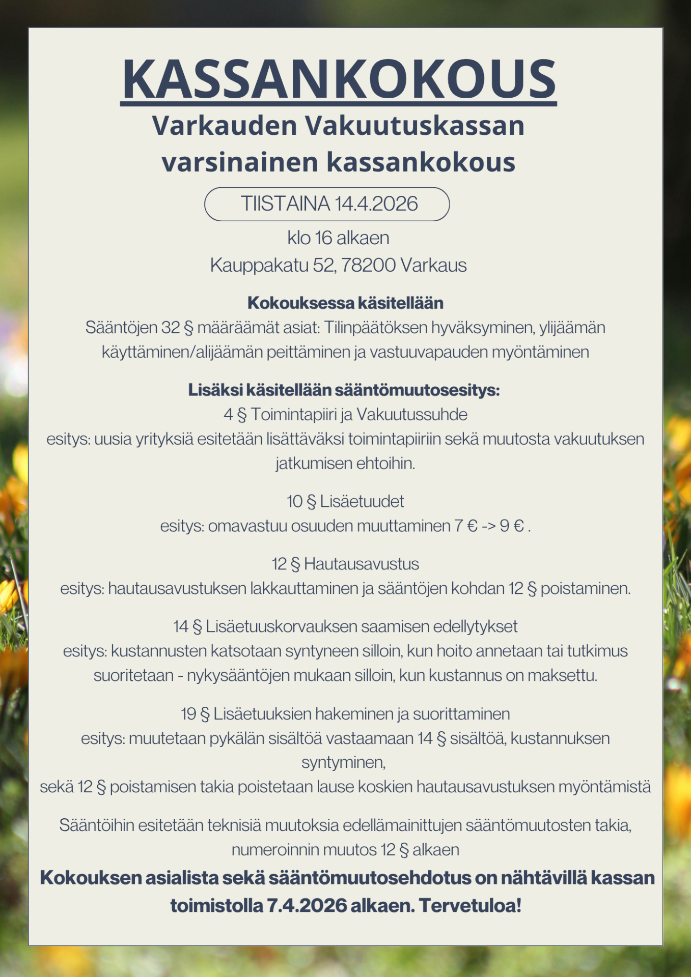 Tällä sivulla julkaistaan kassankokouskutsut säännön mukaisesti aikaisintaan neljä viikkoa, kuitenkin viimeistään viikko ennen kokousta.